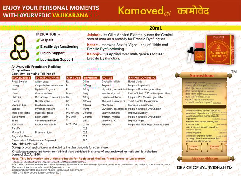 Ayurvidhan Kamoveda oil is a blend of herbs includes onion, lavang, Javitri, Kesar, Kalonji, dalchini, Utangan, Jaiphal, goet testies, earthworm, till oil, Arand oil, and mustard oil. ...