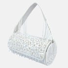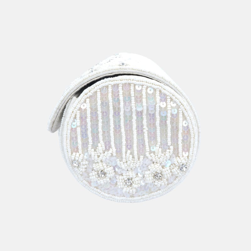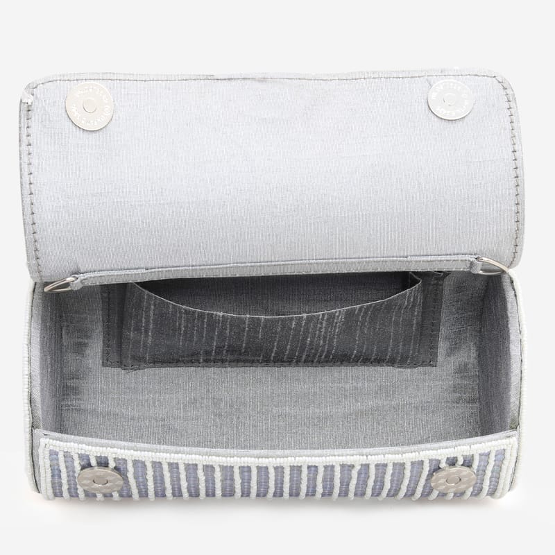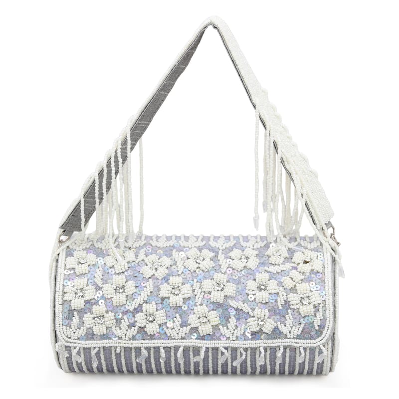 Introducing our exquisite purse with fringes, a perfect blend of elegance and style. Crafted with meticulous attention to detail, this purse features stunning bead and sequence handwork on raw silk, adding a touch of sophistication to any outfit. The magnetic closure ensures secure storage, while the inner silk material provides a luxurious feel. With a removable handle, this versatile purse can be carried as a clutch or worn over the shoulder, making it a must-have accessory for any occasion.