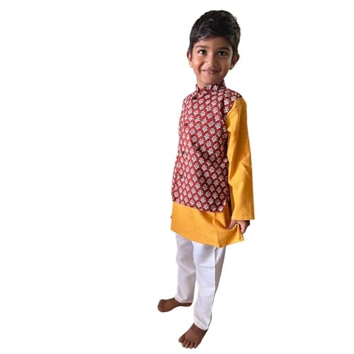 Baby Boy's Cotton Yellow Color Kurta with Red Color Jacket Pyjama Set. Traditional Indian wear long Kurta made from 100% Cotton Comes with easy elastic Pyjama. Regular Fit, Fits True to size, great fit and feel. This kurta and white pyjama set ...