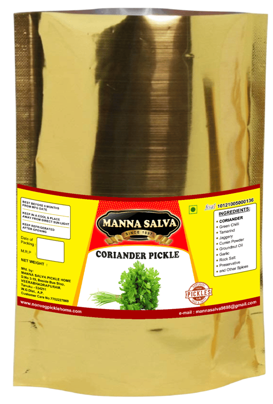 Manna Salvas's Coriander Pickle is a delicious and flavorful pickle made with fresh coriander leaves, green chilies, tamarind, jaggery, cumin powder, groundnut oil, garlic, rock salt, and other spices. This pickle is a great source of vitamins ...