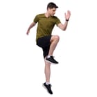 Men's raw edge Outdoor long T-shirt. It has around neck and short sleeves.