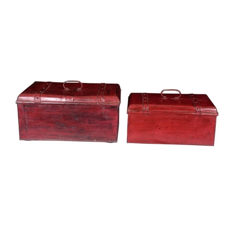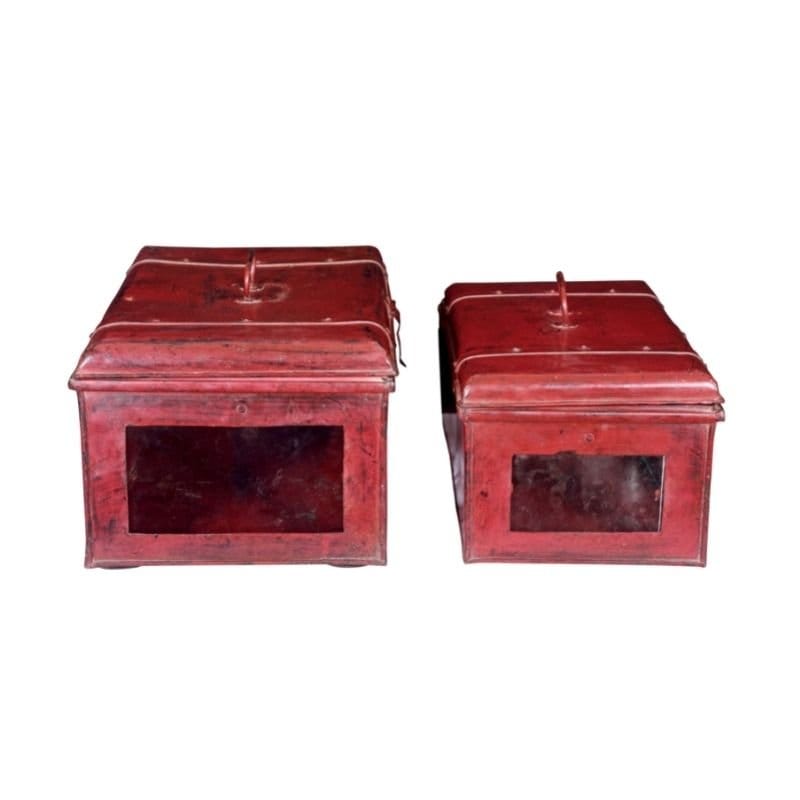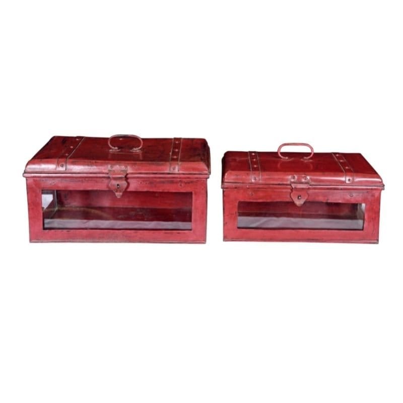 An antique square shape red painted metal, glass box, Various Uses as antique trunk box, showpiece storage, dresser box, makeup storage box. As much utilitarian as unique and eye catching in design and aesthetics, our metal boxes in traditional, contemporary design style. It contain metal frame work on sides with small metal lock hook. It is crafted by old artisans of western Rajasthan, India. Woodwork, and are beautiful accents to perk up any room.