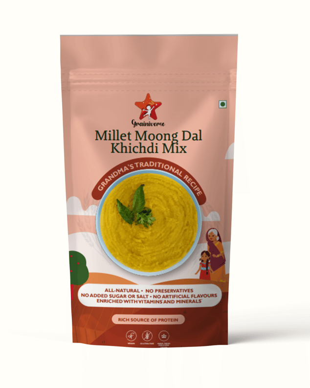 "Millet Moong Dal Khichdi" – specially crafted for your little ones! Made with a delightful blend of Moong dal, Millets, Masoor dal, Black urad dal, and Jeera, this nutrient-rich khichdi is perfect for introducing diverse flavors and esse...