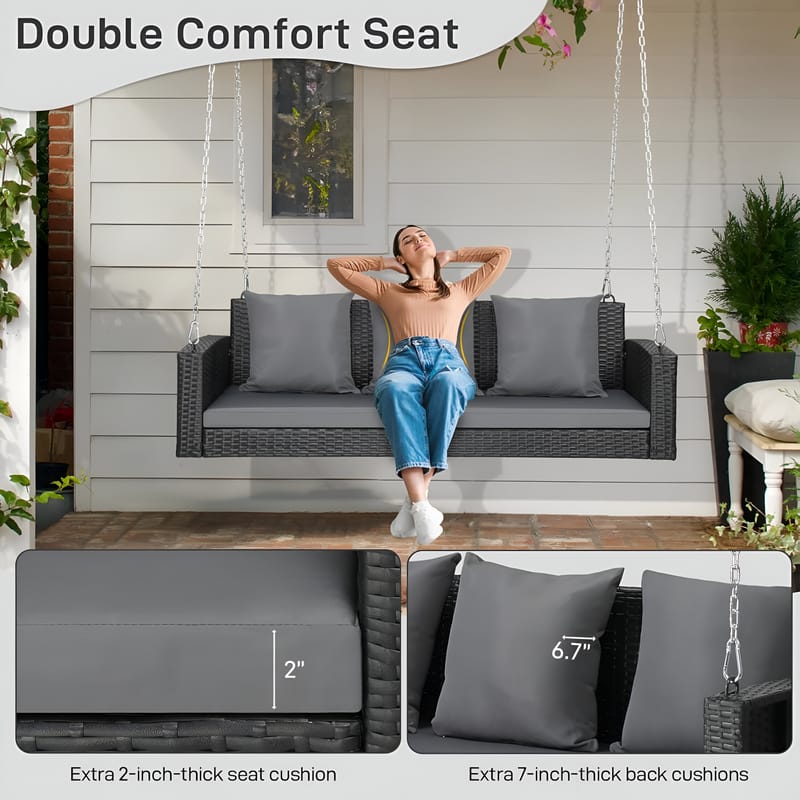 - Patio Swing Chair Dimensions: Length: 63 Inch, Width: 22 Inch, Height: 19 Inch. Wicker Color: Black, Cushion Color: Grey