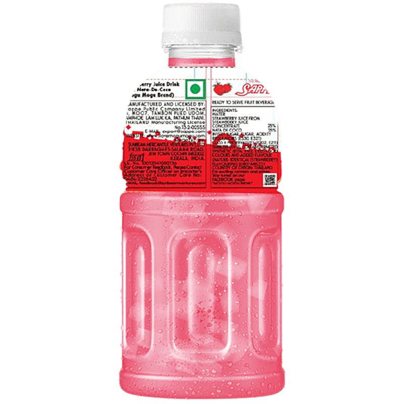 Mogu Mogu Strawberry Juice 25%. Mogu Mogu Strawberry juice drink with Nata de Coco is a refreshing juice drink for a sunny day. Strawberries are rich in antioxidants and this drink preserves all its nutrition.The chewy bits of coconut jelly blende...