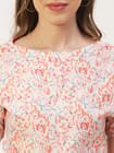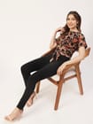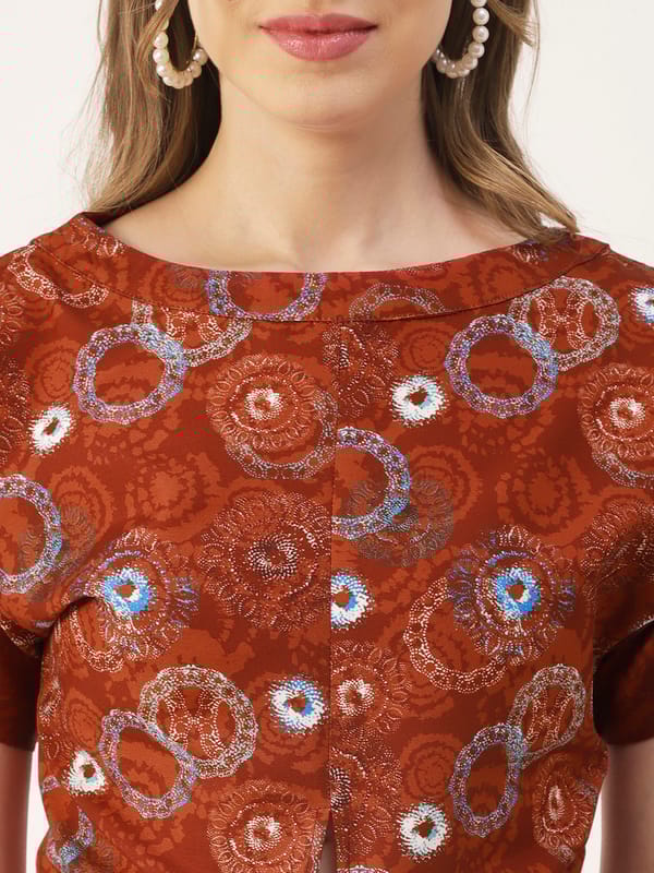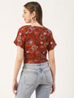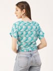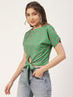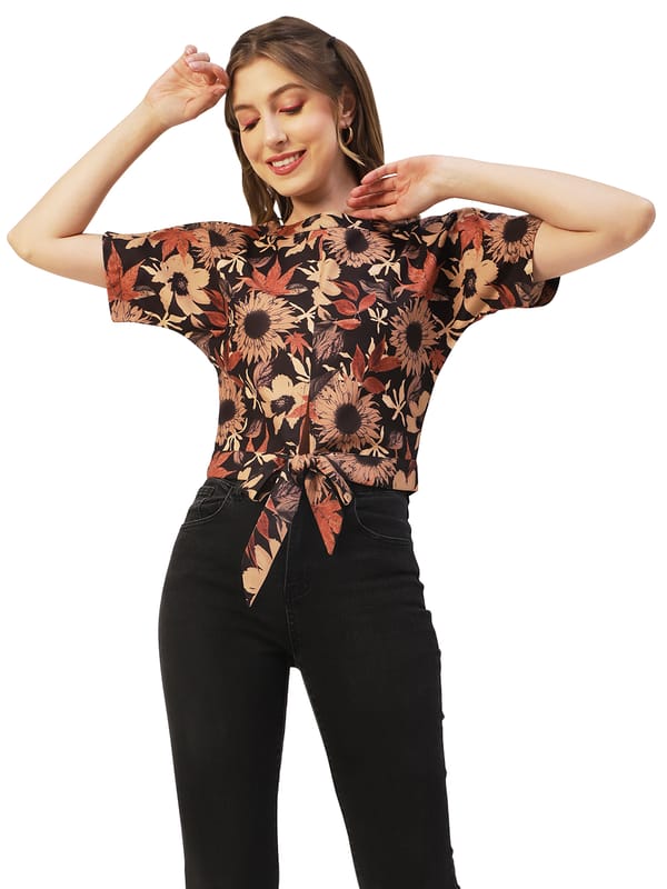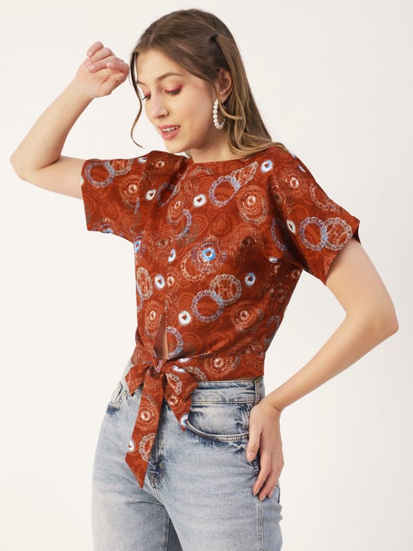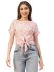 Features: round neck, short sleeves, front knot, cropped length, lightweight and all over printed pattern