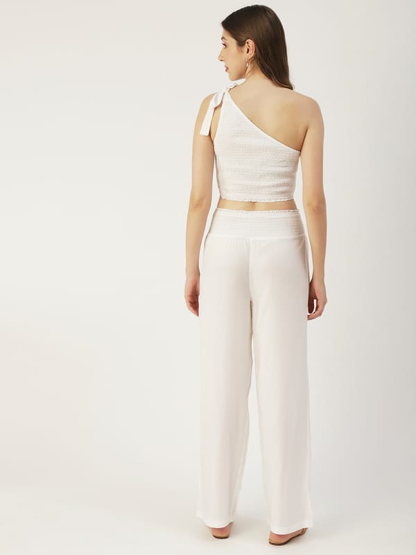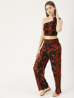 Features: one side tie-up shoulder, crop top, ankle length palazzo, elastic waist, lightweight and all over printed pattern
