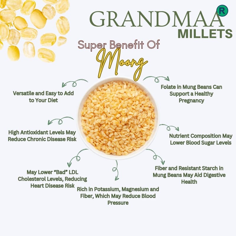 Health Benefits: Moong beans are known for their high protein content, aiding in muscle repair and growth, and their fiber content, promoting digestive health.