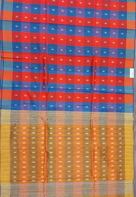Handwoven by humble artisans of Chhattisgarh, the Kosa Silk Saree is rich & luxurious in look. The silk is well known for its purity, softness and sturdiness. It serves to be a glamorous fit for festive/traditional/special occasions. The multicolor check silk saree is decorated with small buta motifs.