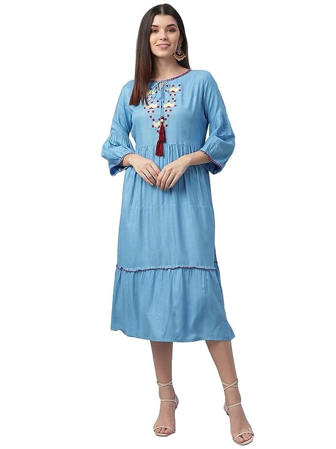 64bf9aa42dcd46497a75b63fNesara Blue Embroidered Rayon Slub Women's Dress