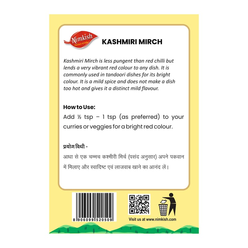 Nimkish Kashmiri Mirch Powder is a culinary delight, especially for tandoori dishes. It can be used as a spice in any North Indian recipe where there are tomatoes or as a base in making your own curry. WIth a vibrant red colour and medium heat,...