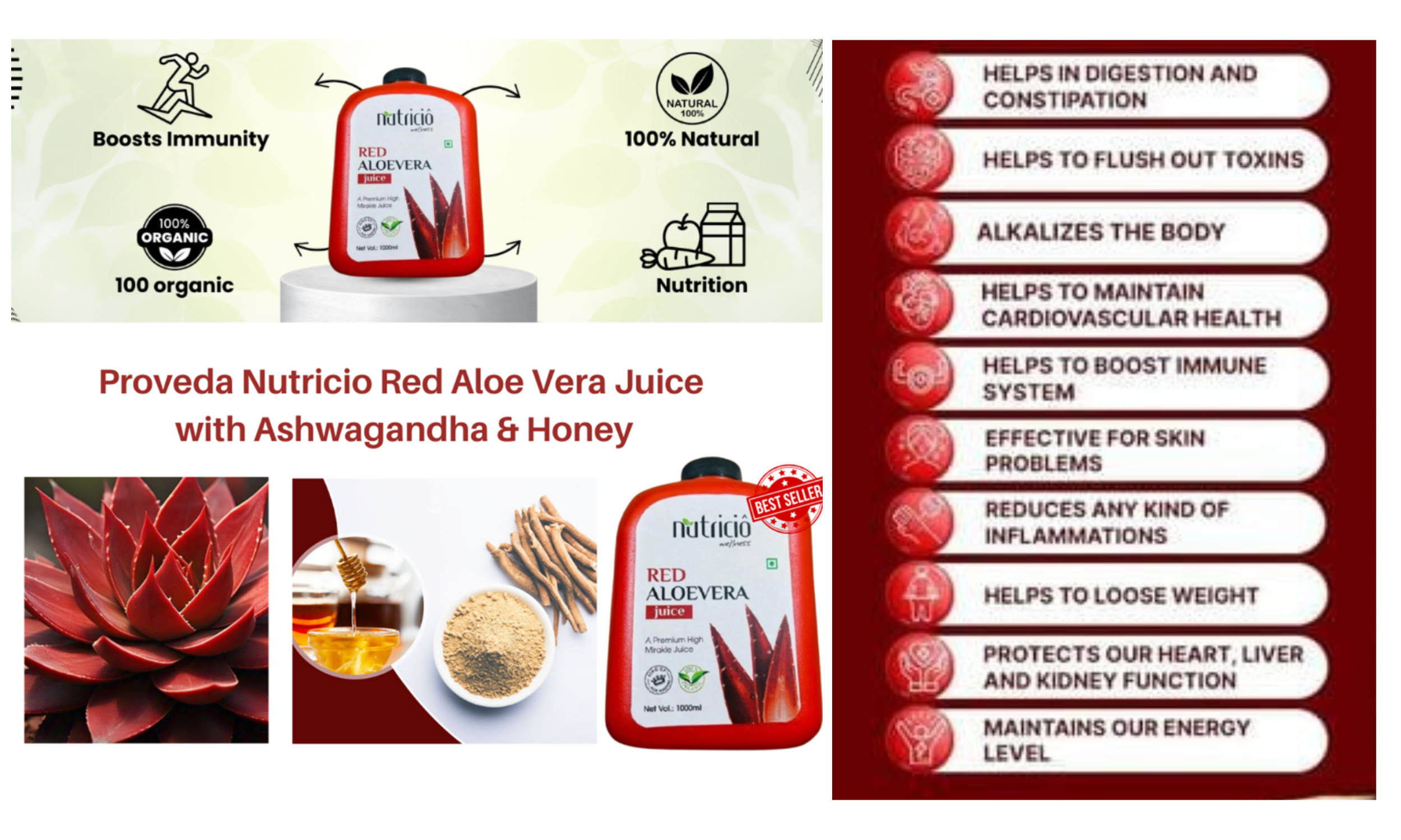 Read MoreNutricio Red Aloe Vera Juice with Honey and Ashwagandha is a powerful blend of nature's finest ingredients designed to boost your immunity and overall health. Red aloe vera is one of 400 species of aloe. It is the king of aloe kingd...