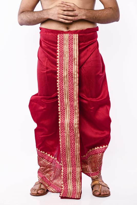 Oblik's Maroon 05 Hand Block Print Dupion Silk Dhoti For Men