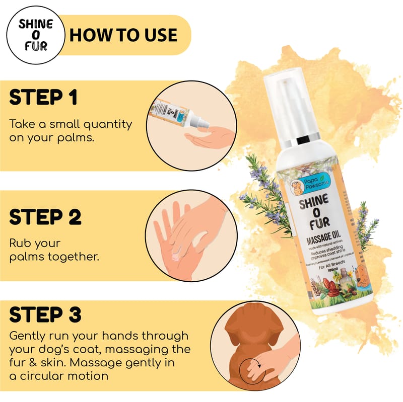 Read MoreShine O’ Fur Massage Oil is the solution to your dog’s happy and relaxed day. Blended with soothing natural oils and ingredients to calm and soothe your pet, Shine O’ Fur Massage Oil reduces shedding and dryness and nourishes ...