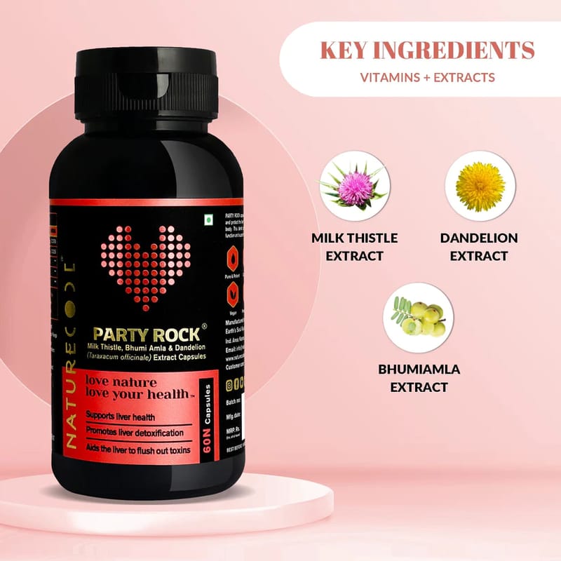 PARTY ROCK Capsule is specially formulated to detoxify, rejuvenate and protect the liver from the effects of harmful toxins present in the body. This blend contains Milk Thistle, Bhumiamla, and Dandelion which are powerful antioxidants that improve liver function and support complete liver health which is important for the overall health of a person.