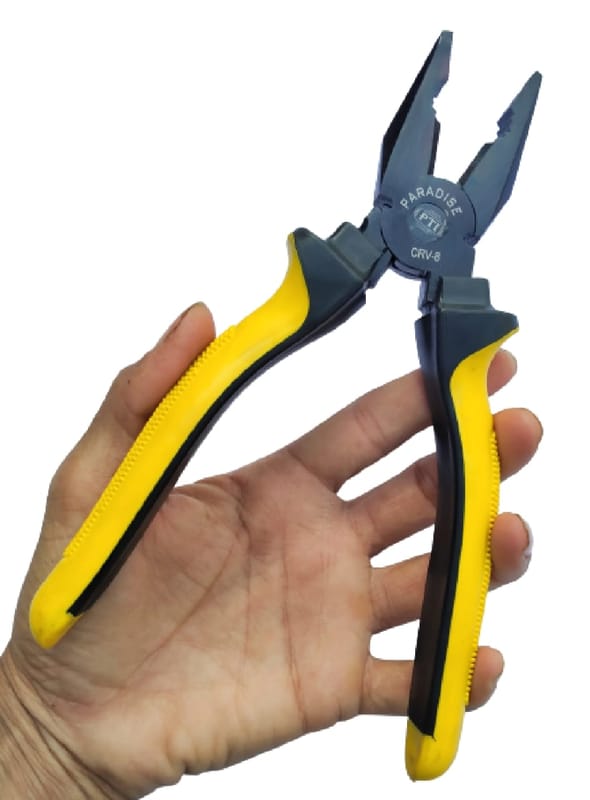 A combination plier is a hand tool used for gripping, cutting and bending wire. An 8-inch combination plier typically has a forged, heat-treated steel construction for strength and durability, with a soft grip handle for comfortable use. The plier has multiple functions including cutting wire, gripping and twisting wires, and bending wires. It has two pairs of jaws: one for gripping and the other for cutting. The cutting jaws are sharpened for efficient cutting of wire, while the gripping jaws have teeth to hold objects securely. Plier is designed to help lineman and electricians work with wire and cables. The plier is designed to let them cut, strip or twist wires conveniently.