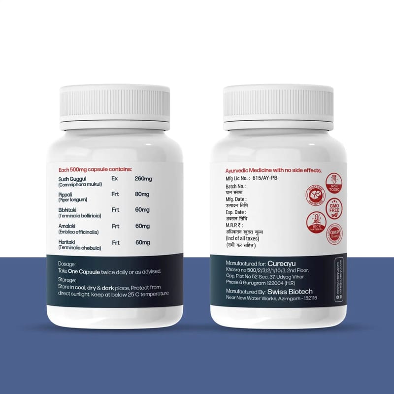 Piles Cure Capsules combine traditional ayurvedic herbs like Pippali, Amalaki, Haritaki, Sudh Guggul, and Bibhitaki. This formulation provides natural relief by soothing discomfort, reducing swelling, and promoting rectal health, ensuring a safe and effective solution for piles relief.