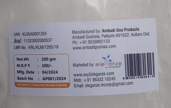 | Manufacturer or packer address | AMBADI GOSHALA, KOLLAM, KERALA |