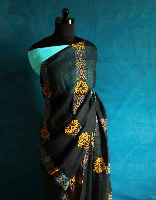 Looking for a saree that combines traditional artistry with contemporary design? Look no further than this Pure Hand Block Printed Linen Saree in black. The saree is embellished with exquisite golden floral hand-block prints that create a...