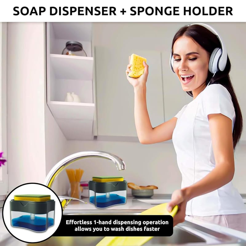 2-IN1 DISPENSER + Caddy, 1 HAND OPERATION, COMPACT ORGANIZATION: Sink dispenser with attached caddy holds sponges, scrubbers, rags, scouring pads in one convenient place while keeping water off of kitchen counters.