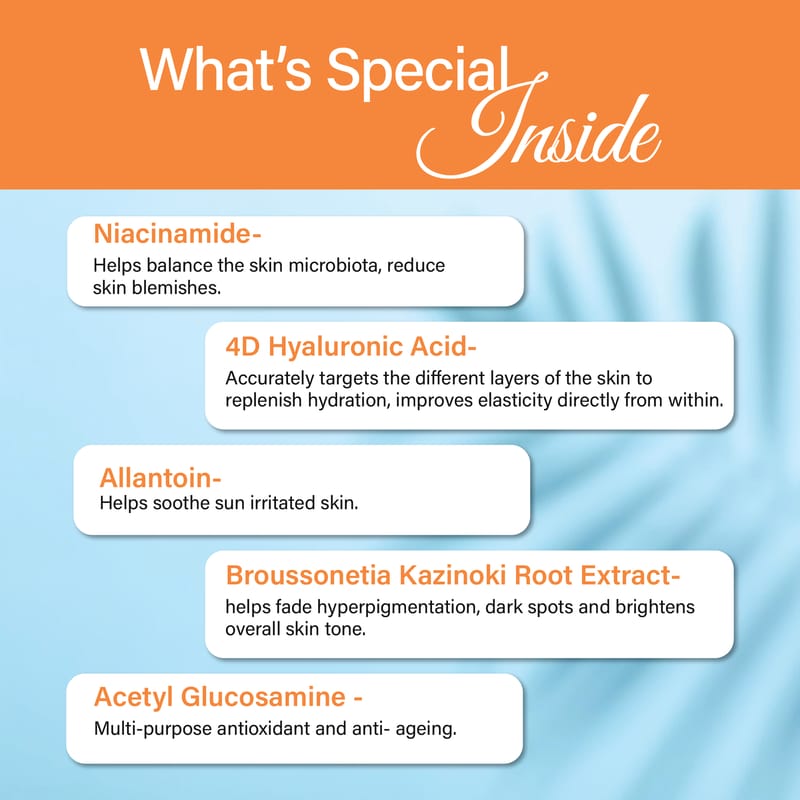 This unique lightweight and non-greasy Hydra Glow sunscreen SPF-50 Face cream with hydration boost of 4D hyaluronic acid is designed to safeguard your skin from sunburns and sun-induced damages. This unique formulation is free of Sil...