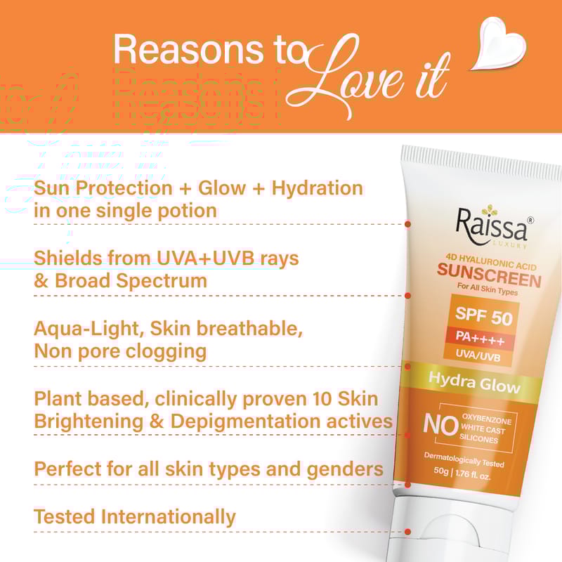 This unique lightweight and non-greasy Hydra Glow sunscreen SPF-50 Face cream with hydration boost of 4D hyaluronic acid is designed to safeguard your skin from sunburns and sun-induced damages. This unique formulation is free of Sil...