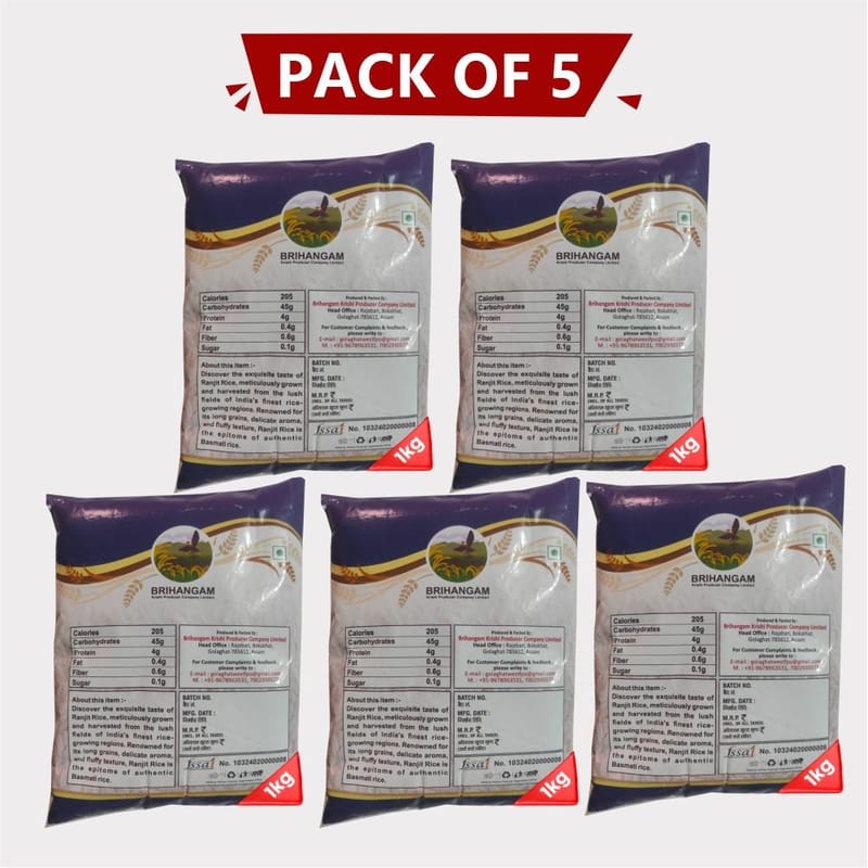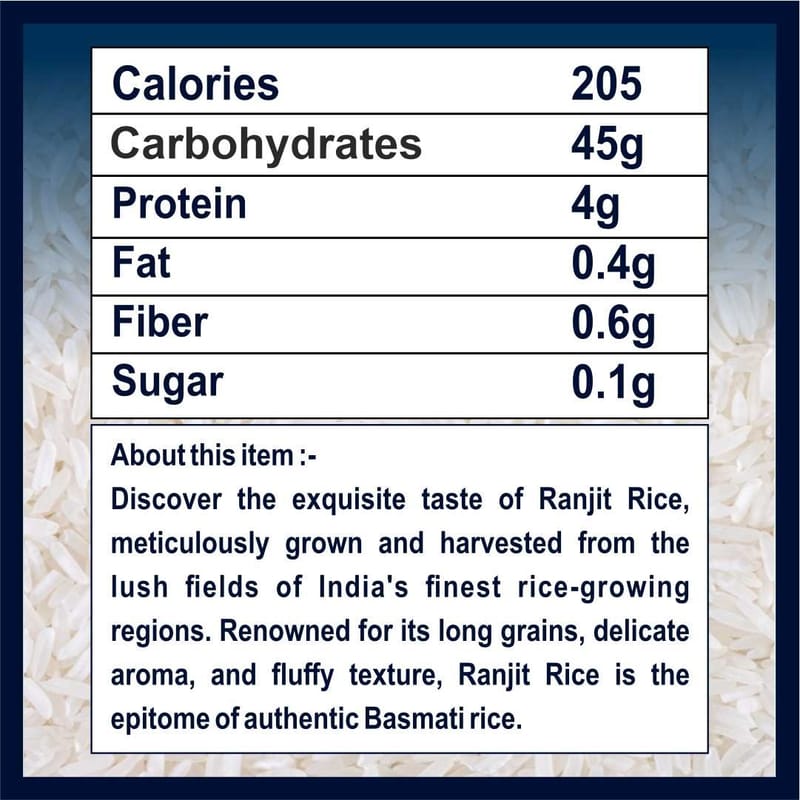 Our Ranjit Rice boasts long, slender grains that cook up fluffy and separate, making it an ideal choice for a variety of rice dishes. Whether you're preparing aromatic biryanis, savory pilafs, or simple steamed rice, Ranjit Rice promises consistency and satisfaction with every meal.