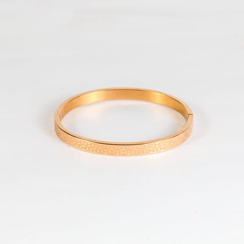 This rose gold open bangle bracelet is crafted from high-quality stainless steel with a geometric design. It features a durable, anti-tarnish finish, making it perfect for daily wear and versatile enough for any outfit.
