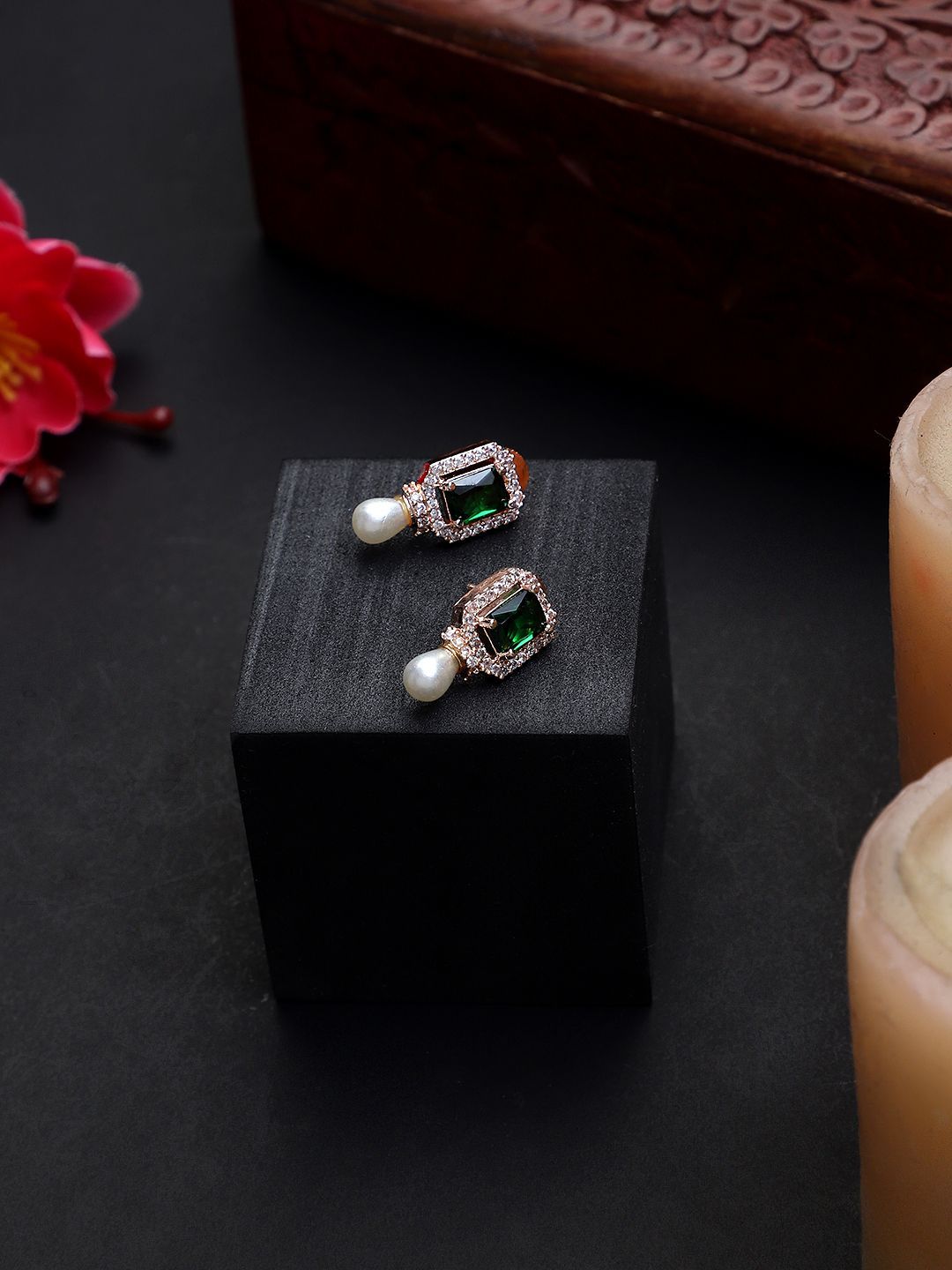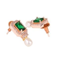 64db751a34b3b0318491b888Rose Gold Plated American Diamond Green Stone Earrings
