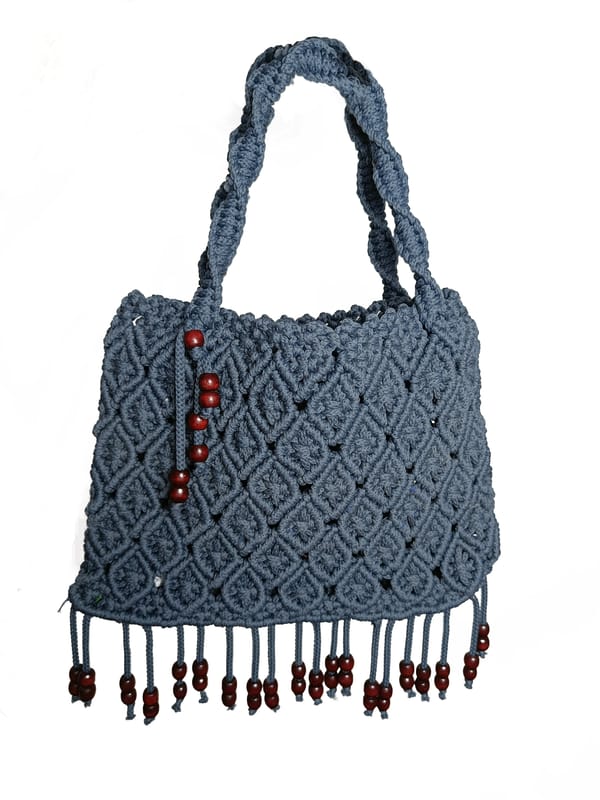 Introducing the Gray Macrame Hand Bag, expertly crafted by skilled artisans from Shazo Handicraft Fashion Producer Company. This stylish bag features a spacious interior with one pocket, perfect for storing your essentials. The bag's dimensions...