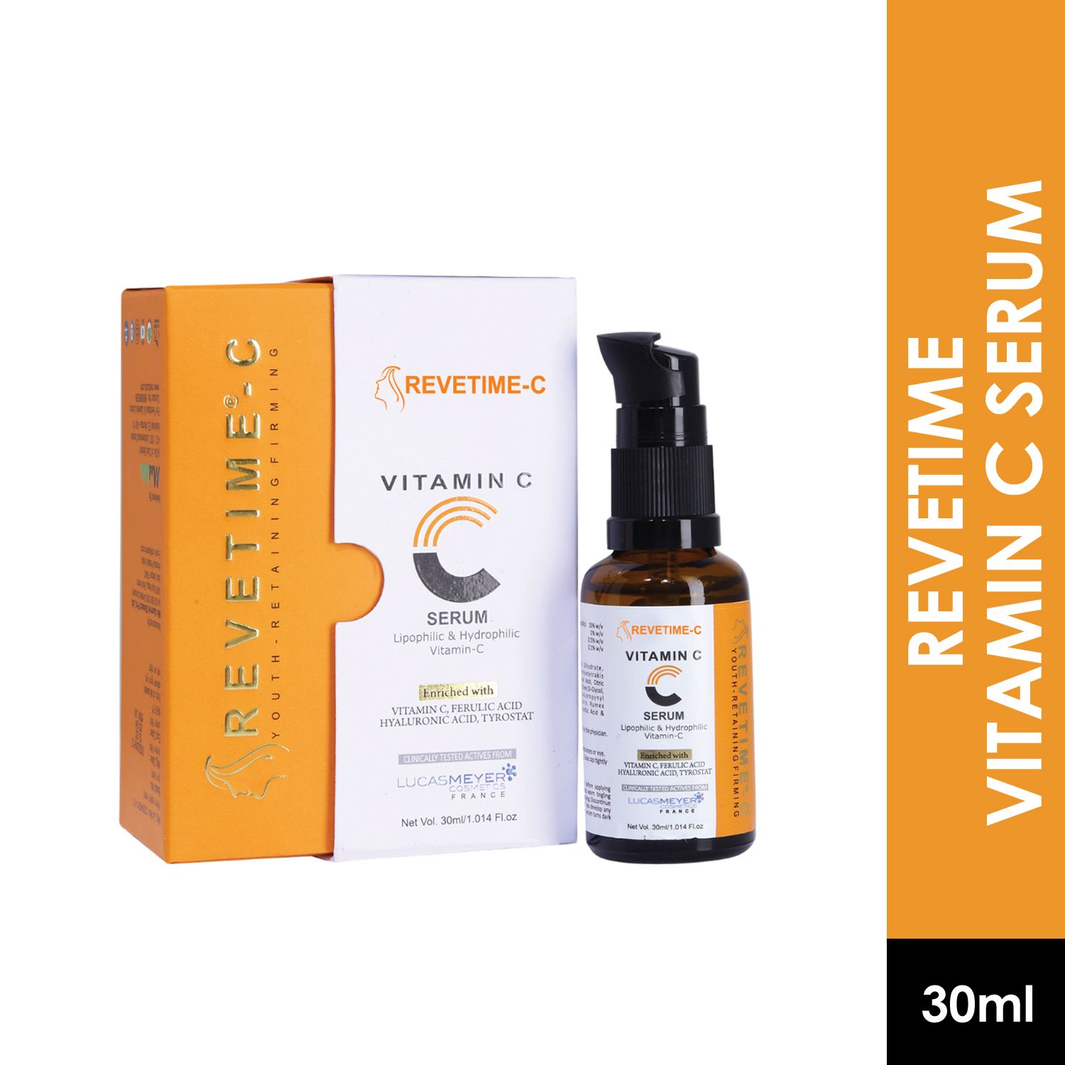 Revetime vitamin C serum is a daily serum that will leave your skin glowing, packed with the goodness of Vitamin C, Tyrostat, ferulic acid, and hyaluronic acid. Its advanced anti-aging formula effectively reduces fine lines, dark spots, pigmentation, and wrinkles, giving you a more youthful and radiant complexion.