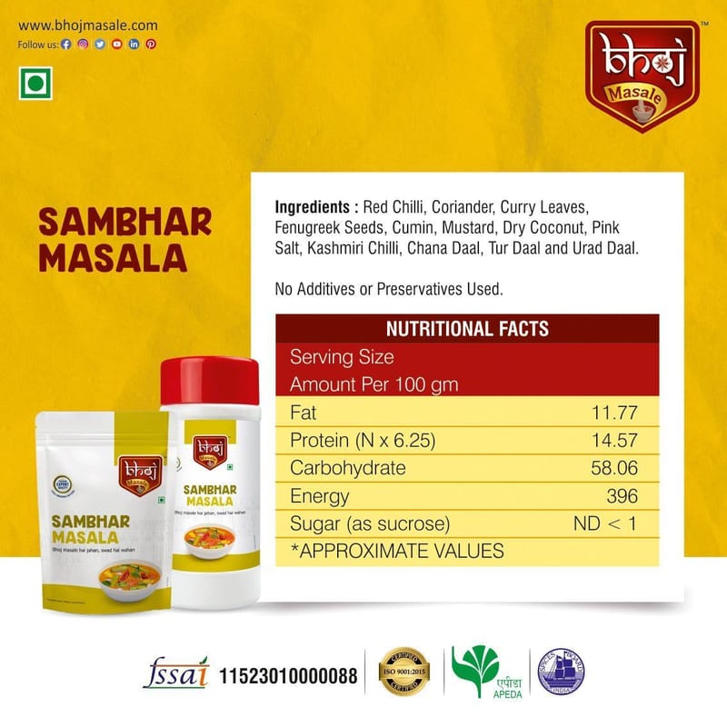 Read MoreWelcome to the aromatic world of Bhoj Masale’s Sambhar Masala Powder! Our Sambhar Masala Powder is 100% Vegan. No Colour, No Pre...