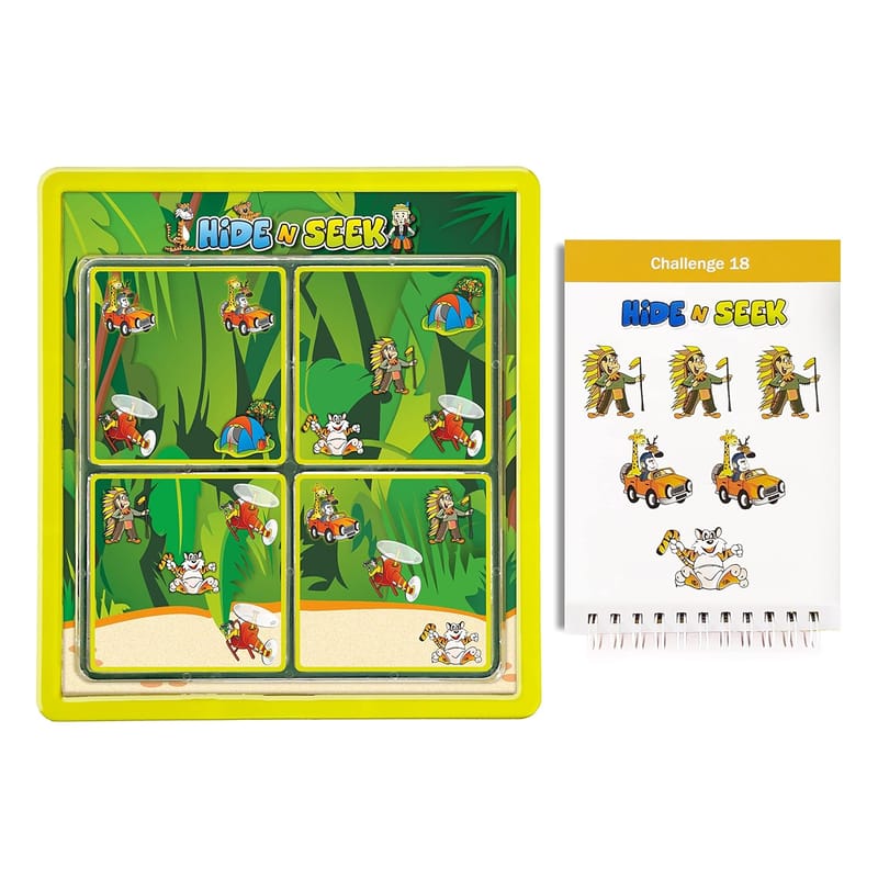 Hide n Seek Jungle. Beware! The jungle holds new challenges for you! Hide and seek is a brain teasing puzzle game, which can be played by anyone from 5 yrs and above. The challenge with this sturdy, travel inspired game is to arrange the 4 puzzle pieces on the game board in such a way that only the animals that appear on the challenge card are visible on the board, and all the others are hidden.A single player game.