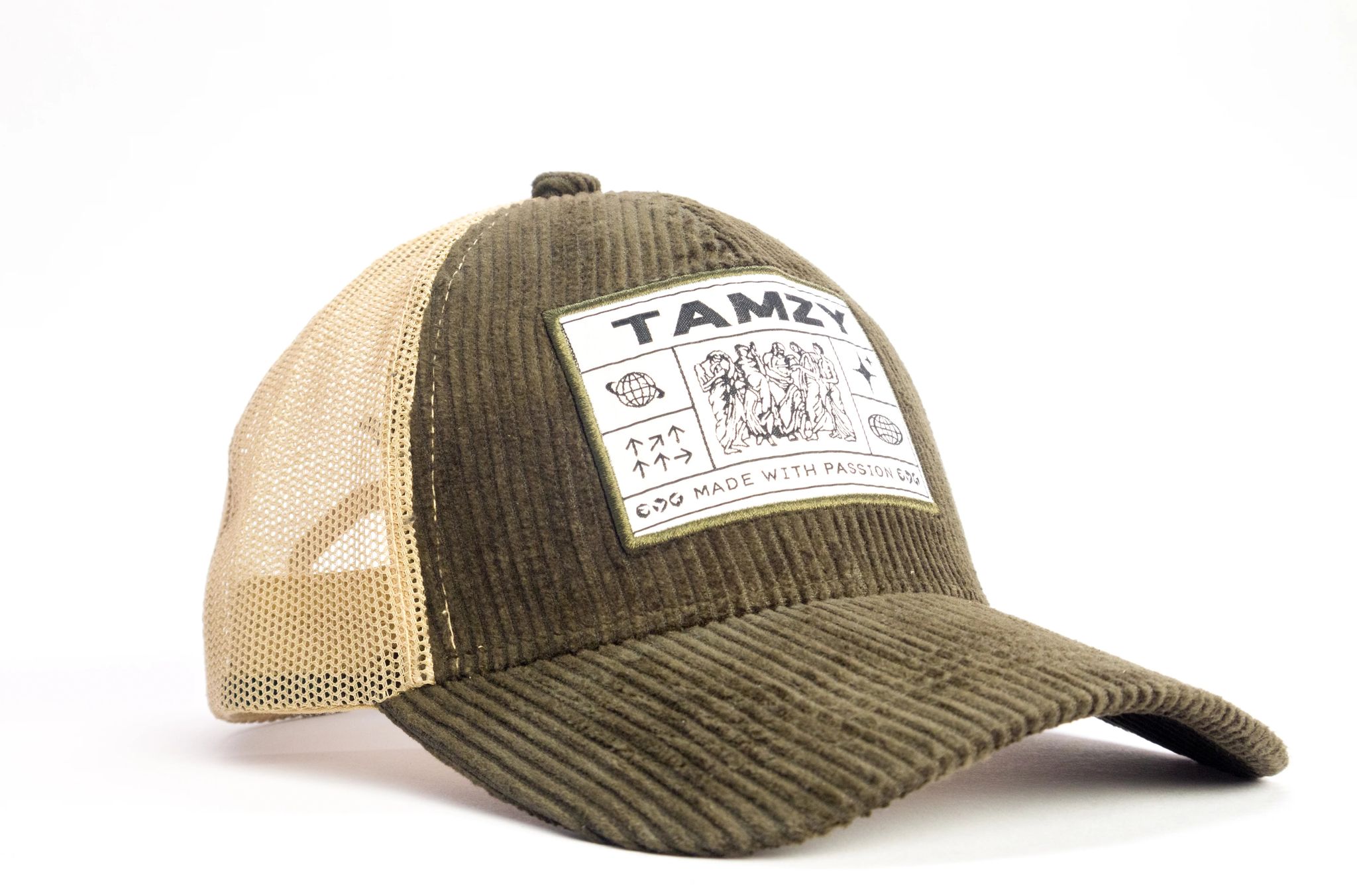 Elevate your style game with this 6-panel trucker cap, crafted from 100% premium corduroy and mesh for ultimate comfort and durability. The olive green and beige tones paired with an ancient-theme woven patch logo and flat embroidery bring a unique vibe to your look. Designed with an adjustable snapback, it’s a one-size-fits-all cap backed by an unbeatable 375-day stitching warranty. Perfect for all-day wear, this cap is where classic meets trendy.