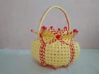 This is a handmade, plastic beaded basket. It is perfect for storing small items such as keys, change, or jewelry. It would make a great gift for any occasion.