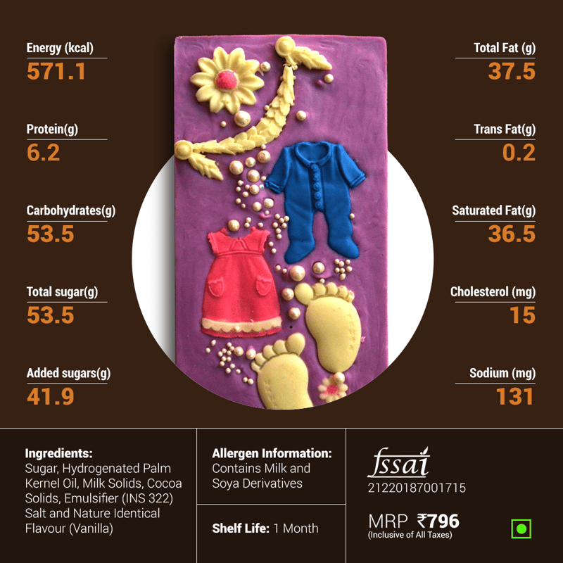 | Nutritional information | 1. Energy (kcal) - 571.1 2. Protein(g) - 6.2 3.Carbohydrates(g) - 53.5 4. Total sugar(g) - 53.5 5. Added sugars(g) - 41.9 6. Total Fat (g) - 37.5 7. Trans Fat(g) - 0.2 8. Saturated Fat(g) - 36.5 9. Cholesterol (mg) - 15 10. Sodium (mg) - 131 |