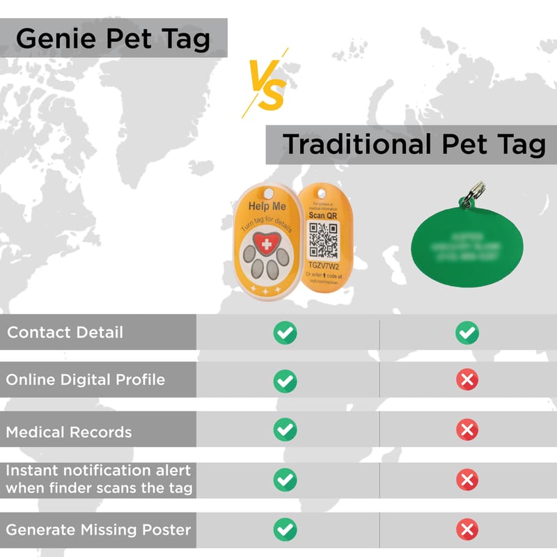 Locate Your Missing Pet - Lost your dog or cat? Find a pet with this dog finder and cat finder tag! This pet tag sends you an email notification when a finder scans the QR code. Like a pet tracker, it provides the signals GPS Position where the scan took place. Log into the Genie Smart Tag website to get it. Finder Tags with Emergency contact - Keep this cute collar tag on your pet all the time. The pets ID tag lets the finder see the pet parent's contact details and the pet’s medical information. You may also store multiple contacts details, which include other caretakers. Manage Your Pet’s Digital Profile - Make sure that your dog ID tag and cat ID tag has your pet’s info. Create your dog or cat's online profile with photo, vaccinations, allergies and other information. Registering on the website activates the smart tag and keeps your pet’s details in one place, Safe & Secure Instantly Generate Missing Posters - Create a digital missing poster of your dog or cat via the Genie Smart Tag website. With just one click, you can immediately share it on social media. Arrange Important Reminders and Alerts - The mobile website that comes with this pet ID helps set important reminders. You can schedule your pet’s vaccination, deworming, grooming and other alerts on the website. With this QR code pet id tag, keeping tabs on your pet’s activities is easy!