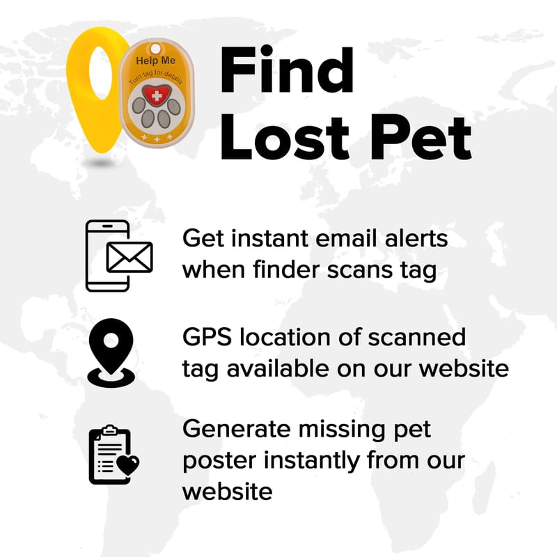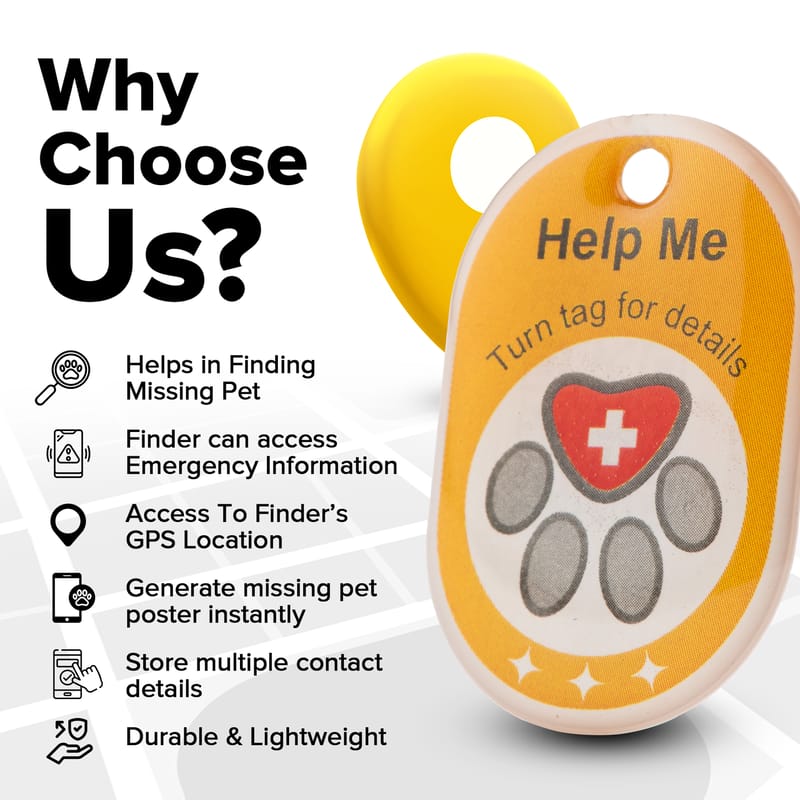 Finder Tags with Emergency contact - Keep this cute collar tag on your pet all the time. The pets ID tag lets the finder see the pet parent's contact details and the pet’s medical information. You may also store multiple contacts details, which include other caretakers.