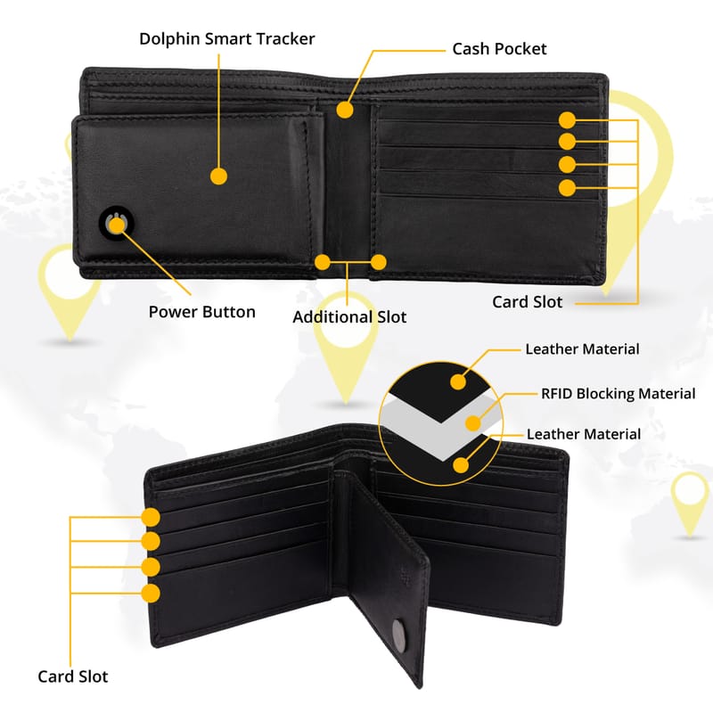 Efficient Smart Wallet - Secure your cash and cards with our smart purse for men. This slim wallet has a (Bluetooth Low Energy) BLE-based tracker that gives a GPS live location when your mobile device is within the tracker’s range. The DOLPHIN tracker app shows the last seen location when it goes out of range.