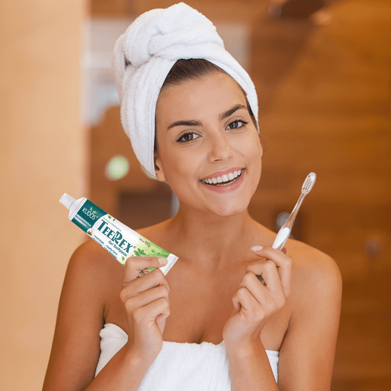 Brush thoroughly in the morning and before going to bed with Kudos Teerex Toothpaste or as directed by the physician/ dentist.