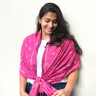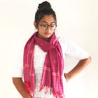 A two-tone red-purple Ikat scarf with tiny floral butis all-over and a simple striped end piece. Isn't it just right for a bright day outing draped over your favo...