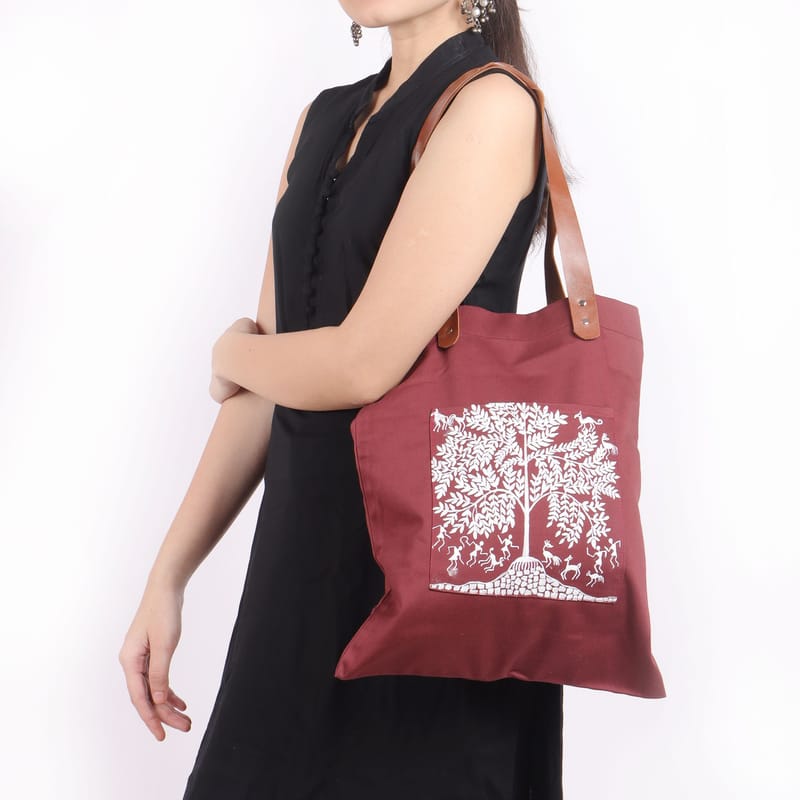 Cotton Linen tote bag with Warli hand paint over it. Stylish and comfortable, Easy to carry, and lightweight.