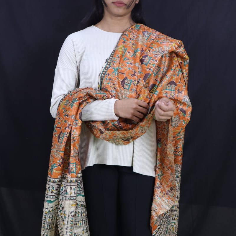 681d45449b7b8ab12002780fTribal Design Multi Color Tussar Silk DupattaThese lovely Dupattas are made from the finest Tussar silk, also known as Kosa silk and come from a wide-winged moth. Its dull gold texture serves as an ideal foundation for embroideries and print motifs that draw inspiration from nature. Product Specifications:- Materials:- Tussar Giccha Silk Length :- 2.50 mtr Width :- 0.90 mtr Colour hues may slightly vary from that which appears in the image. Special Instructions:- Suggested Dry Clean Store in a Clean and Dry Place, away from Insects, Dust, Excessive light, and Moisture.CU344I586