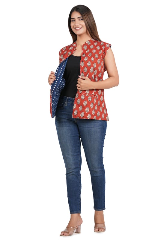 Tribes India brings one of the most famous Bagru Hand Block Printed Jackets, embracing the essence of tradition and fashion with these one-of-a-kind pieces, where every stitch tells a story. Features traditional Bagru block printing this sleeveless jacket is a perfect addition to any ethnic apparel. Made of lightweight, soft and skin-friendly cotton fabric. This product is Hand-crafted by the Tribal weavers of Rajasthan. Hand-stitched with a neat and clean finish. Made under the Atmanirbhar Bharat scheme to empower Tribal artisans of India.