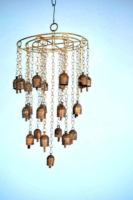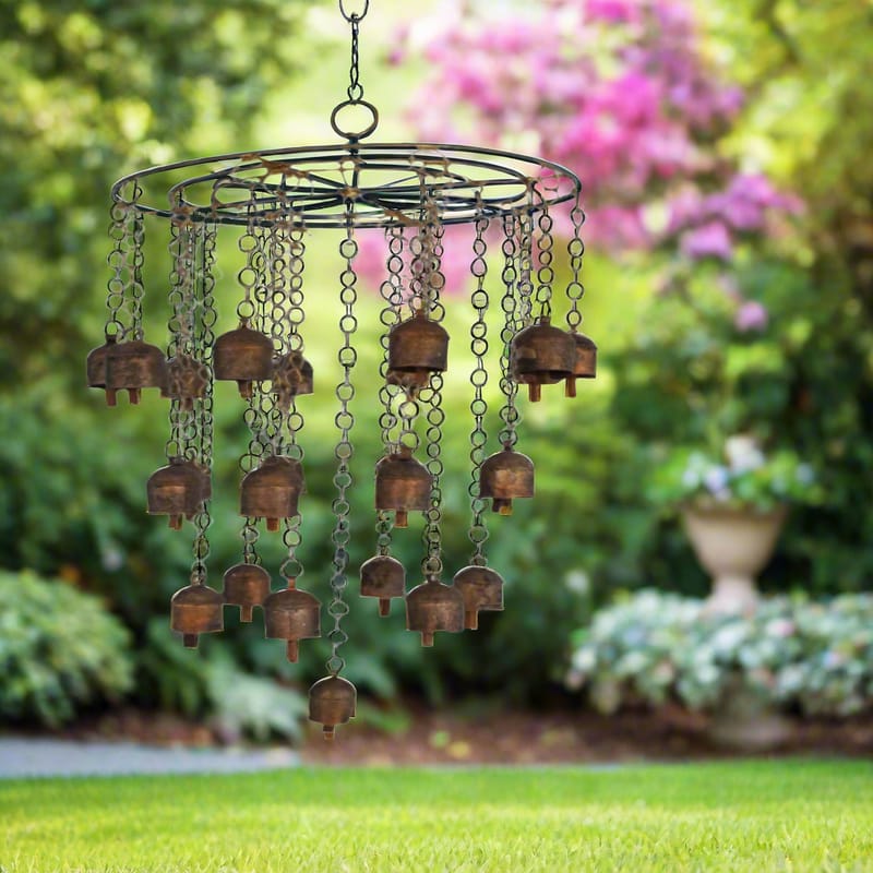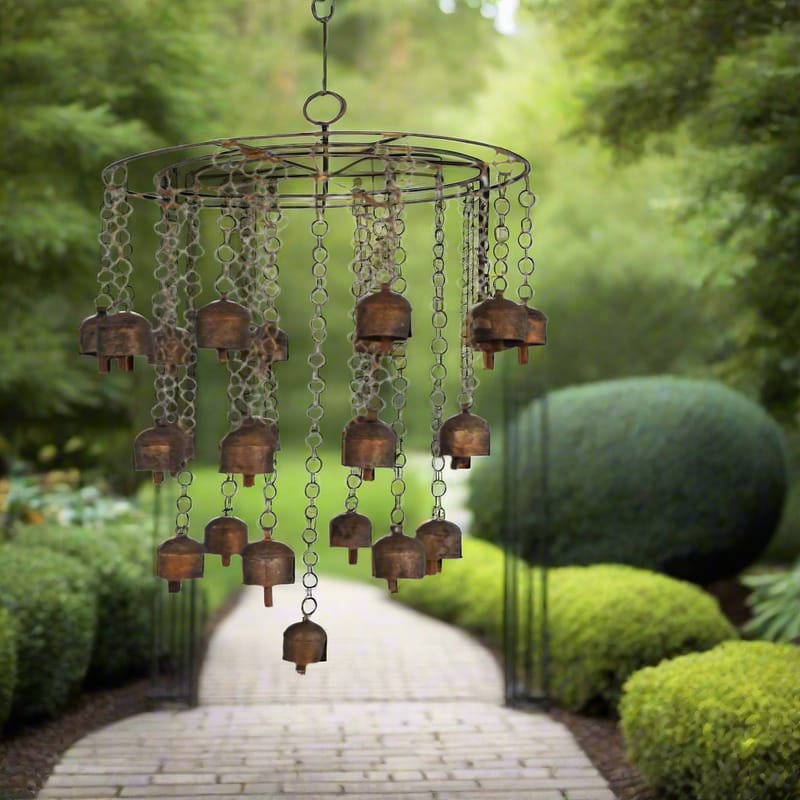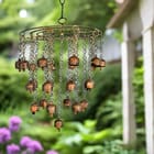 This beautiful wind chime is made of 18 copper bells and 6 iron chains. It measures 30 inches in diameter and 48 inches in length. The bells are arranged in a circular pattern and are suspended from the chains. The wind chime is finished with a...