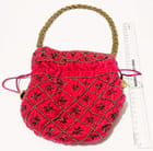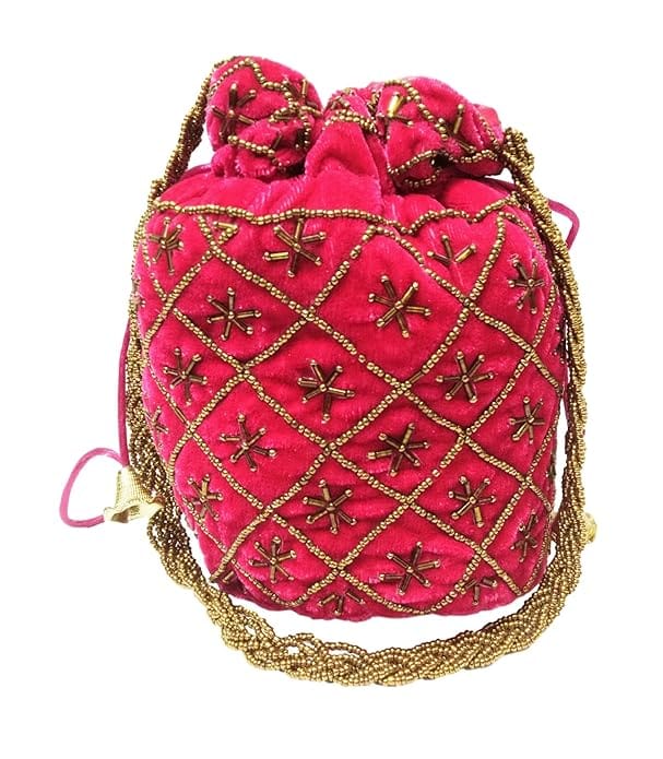 A velvet potli bag with a drawstring closure, featuring golden work and a moti (pearl) beaded handle, is a stylish and elegant accessory perfect for traditional occasions.
