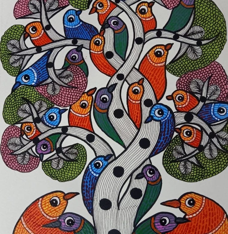 Painted freehand, the mind-blowing painting reflects the tribal artists perception of life. They put brush straight to canvas or paper, and seldom need an outline or rough sketch. These trib Best of Madhya Pradesh al artisans have developed a unique style of painting using bright colors, embellished with dots and lines. Beautiful creatures are seen in these paintings. These paintings have gained popularity because of their bold, creative, aesthetic, and expressive depiction.