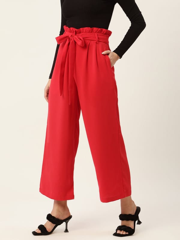 6663f8e9b97f5600249f9cf5Women Red Comfort Fit Pleated Trousers with Belt