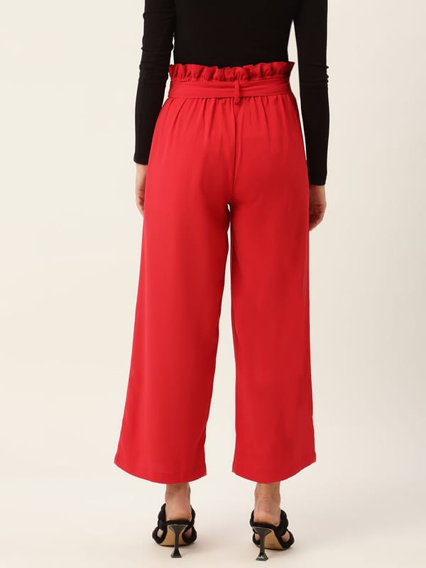 Women Red Comfort Fit Pleated Trousers with Belt