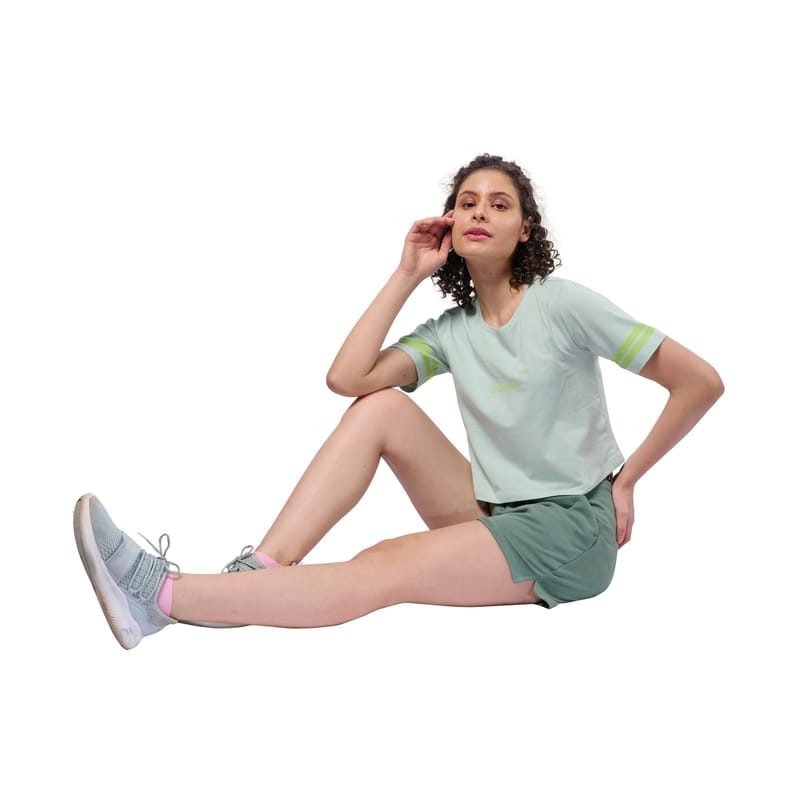 Women's 95% organic chest branded pastel Crop top with printed sleeve stripe. It has a round neck and short sleeves with stripes